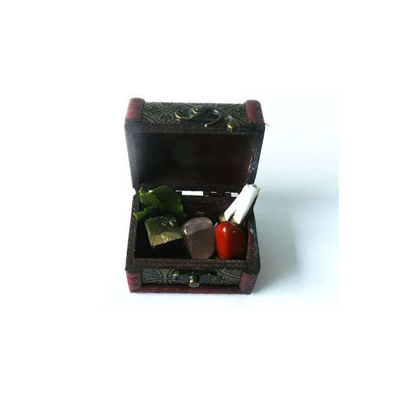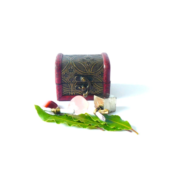Ritual para la Noche de San Juan. Potente Ritual para la noche de San Juan con todos los elementos necesarios: Un cofre para guardar nuestras peticiones hasta el año siguiente, pergaminos para escribir nuestros deseos, Hojas de Laurel, piedra de Jaspe Rojo para la Salud, Pirita para la economía y Cuarzo Rosa para el Amor. Incluye instrucciones de uso.
